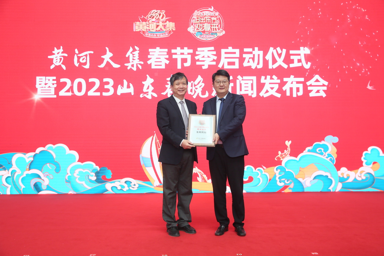 活動現場,程守田同志、呂芃同志分別為2023山東春晚戰略合作城市威海市和2023山東春晚獨家冠名企業東阿阿膠股份有限公司授牌。