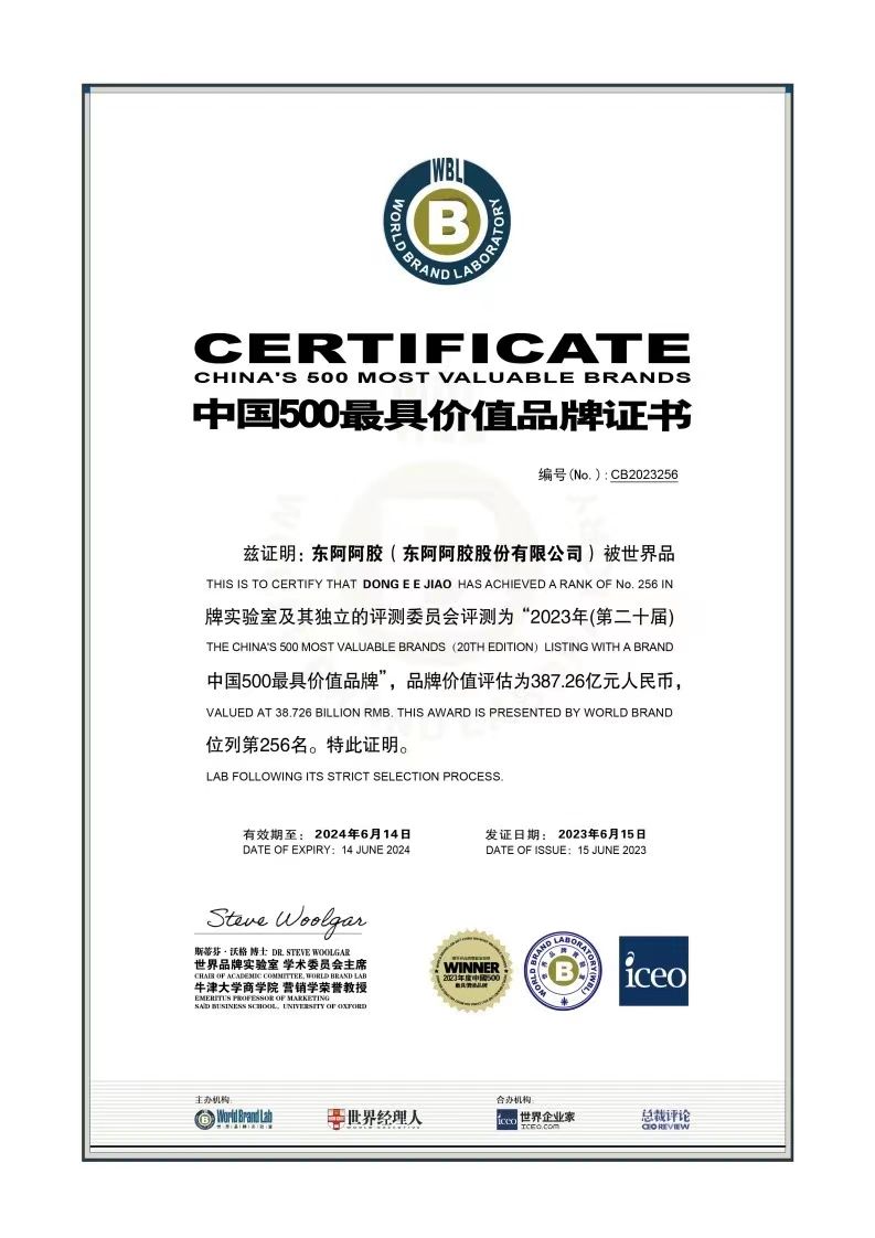 6月15日,由世界品牌實驗室主辦的2023年“中國500最具價值品牌”發(fā)布會在北京舉行。會上發(fā)布了2022年《中國500最具價值品牌》分析報告(以下簡稱《報告》)。東阿阿膠以387.26億元人民幣的品牌價值榮登《中國500最具價值品牌》榜單(以下簡稱《榜單》)第256位,品牌價值較去年提升16%。