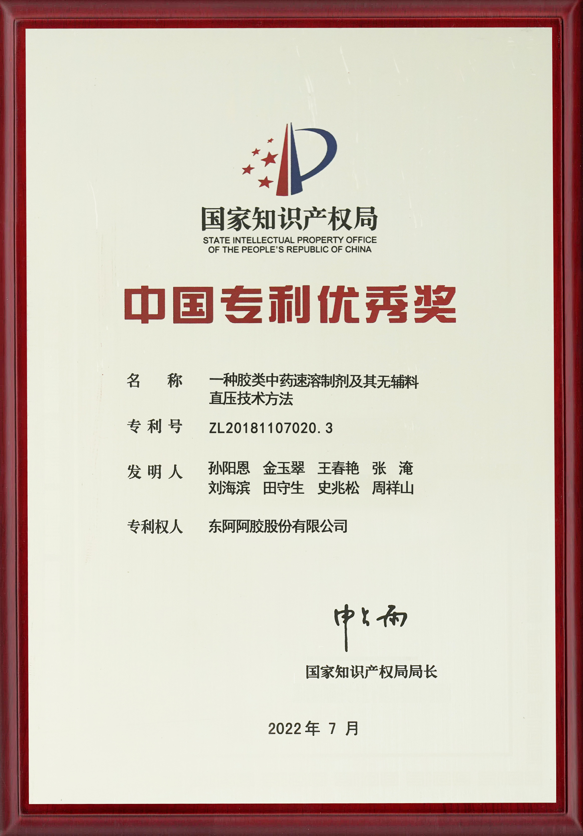 中國專利獎(jiǎng)是國家知識產(chǎn)權(quán)局設(shè)立的知識產(chǎn)權(quán)最高獎(jiǎng),由國家知識產(chǎn)權(quán)局與世界知識產(chǎn)權(quán)組織共同開展評選,每年舉辦一屆。“一種膠類中藥速溶制劑及其無輔料直壓技術(shù)方法”是東阿阿膠榮獲的第六個(gè)中國專利獎(jiǎng)優(yōu)秀獎(jiǎng)。