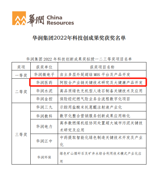 華潤集團(tuán)科技創(chuàng)新成果獎(jiǎng)是華潤集團(tuán)設(shè)立的科技創(chuàng)新最高獎(jiǎng),由華潤集團(tuán)開展評選,每年評選一次。“阿膠全產(chǎn)業(yè)鏈關(guān)鍵技術(shù)研究與大健康產(chǎn)品開發(fā)”項(xiàng)目是東阿阿膠榮獲的第一個(gè)華潤集團(tuán)科技創(chuàng)新成果獎(jiǎng)。