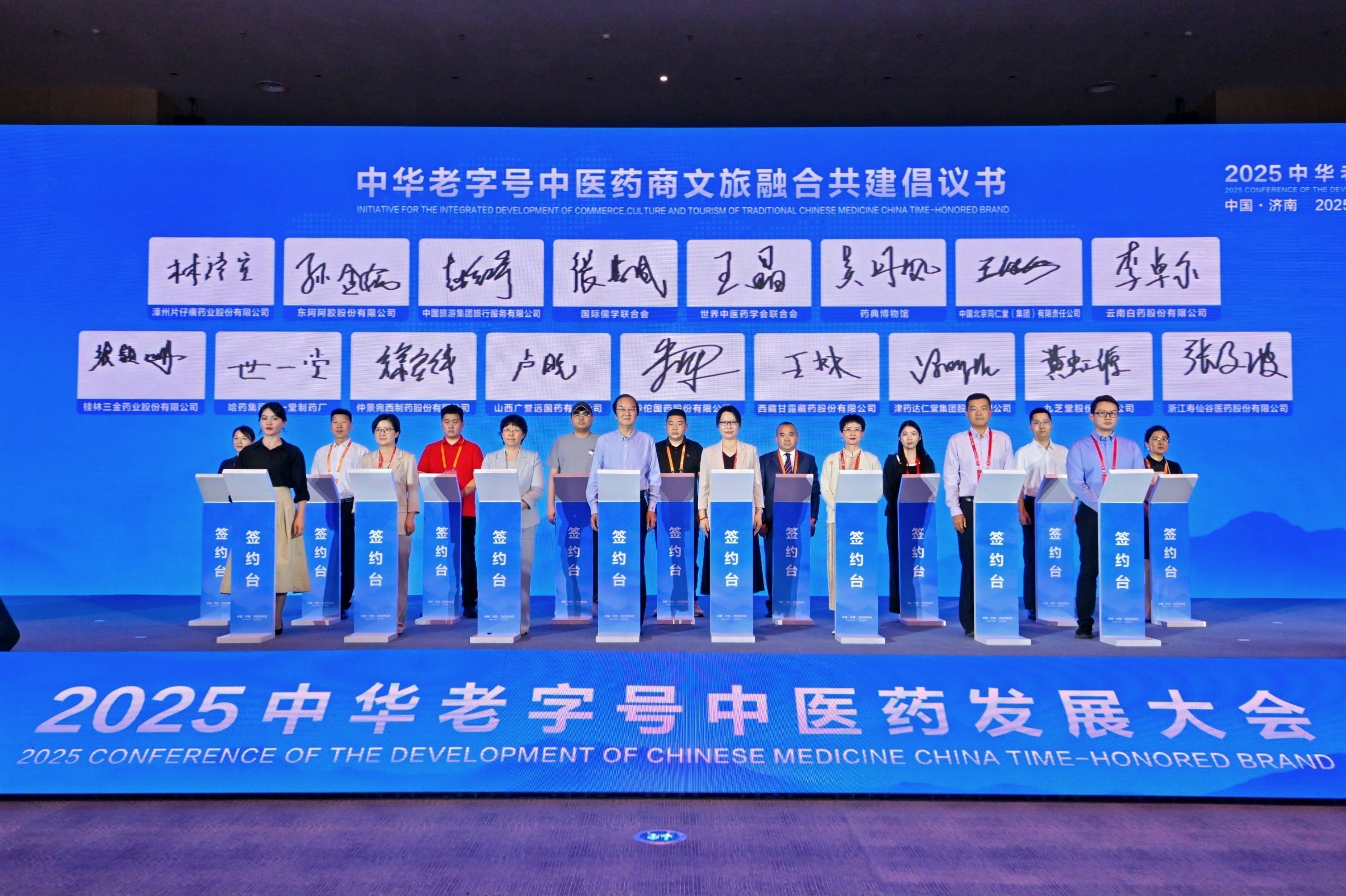 開幕式當天還舉辦了2025中華老字號中醫藥發展大會,來自全國各地的知名中華老字號中醫藥企業集聚一堂,圍繞中醫藥老字號集聚發展、“商文旅”融合打造新消費場景、提升國際傳播效能等議題,共商中醫藥傳承創新發展的戰略路徑。東阿阿膠總裁孫金妮作為山東省老字號企業協會輪值會長單位代表致辭,并參與簽署了《中華老字號中醫藥商文旅融合共建倡議書》。