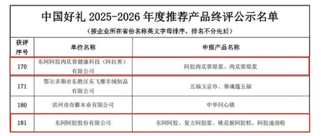 近日,中國(guó)國(guó)際貿(mào)易促進(jìn)委員會(huì)商業(yè)行業(yè)委員會(huì)在浙江杭州召開中國(guó)好禮產(chǎn)業(yè)促進(jìn)計(jì)劃2025—2026年度推薦產(chǎn)品終評(píng)會(huì)。東阿阿膠股份有限公司(以下簡(jiǎn)稱“東阿阿膠”)四大主產(chǎn)品東阿阿膠、復(fù)方阿膠漿、桃花姬阿膠糕、阿膠速溶粉及旗下肉蓯蓉健康科技(阿拉善)有限公司的阿膠肉蓯蓉原漿、肉蓯蓉原漿等共計(jì)六款產(chǎn)品,在全國(guó)超5000款產(chǎn)品中脫穎而出,成功入選“中國(guó)好禮2025-2026年度推薦產(chǎn)品”名單。