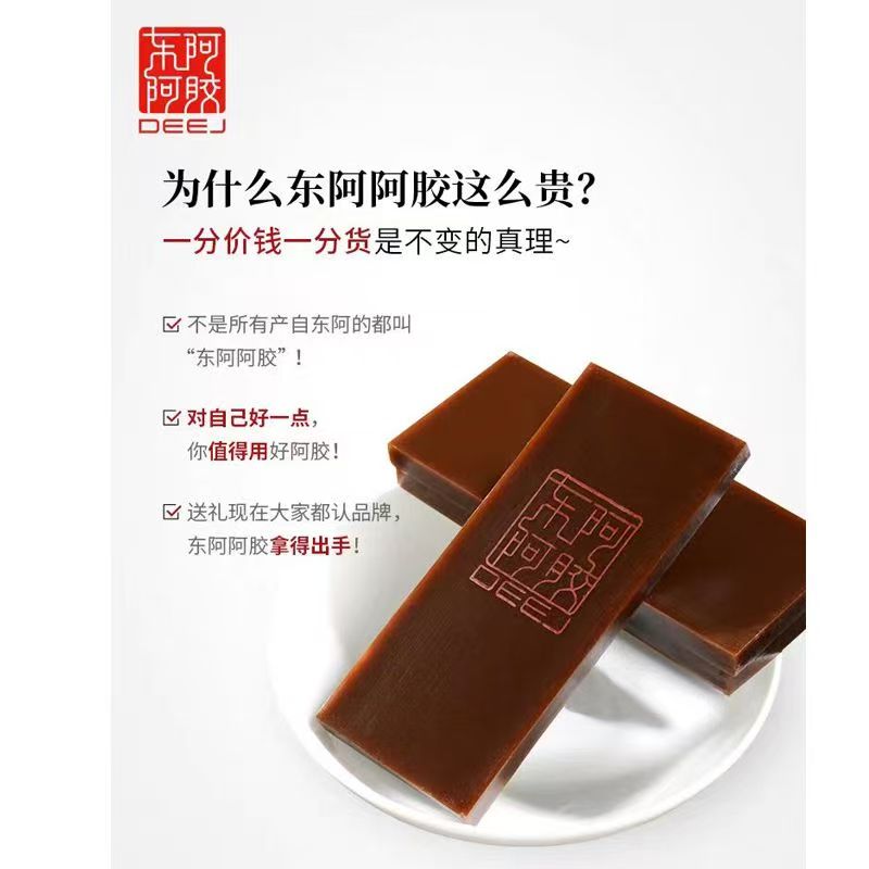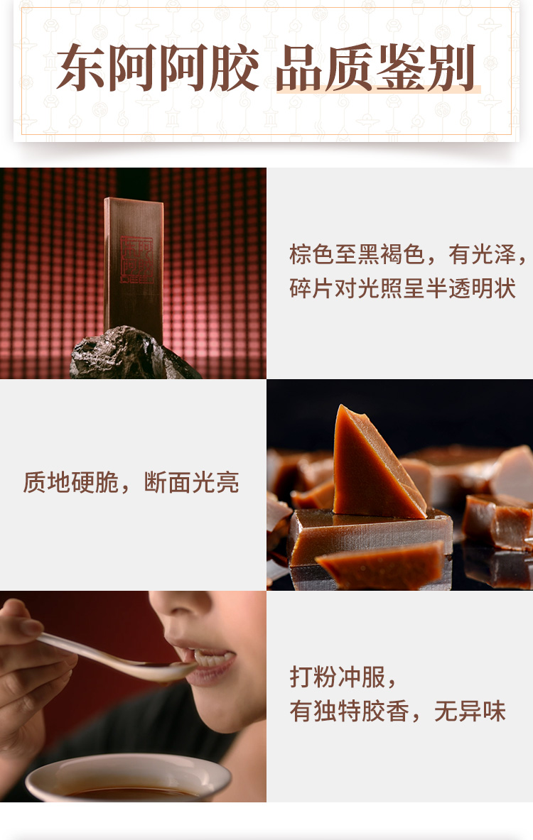 性狀:本品呈長方形塊,方形塊成丁狀棕色至黑褐色,有光澤,質硬而脆,斷面光亮,碎片 對光照視呈半透明狀。氣微,味微甘。味甘,性平,無毒;歸肺、肝、腎經。 適應癥:補血滋陰、潤燥、止血。用于血虛萎黃,眩暈心悸、心煩不眠、肺燥咳嗽。根據 2020 年版《中國藥典》,其中適應癥根據阿膠所屬非處方藥/處方藥/保健品類目不同具備不同的 適應癥功能,另有處方適應癥:用于血虛萎黃,眩暈心悸,肌痿無力、心煩不眠、虛風內動、 肺燥咳嗽、勞嗽咳血、吐血尿血、便血崩漏、妊娠胎漏。